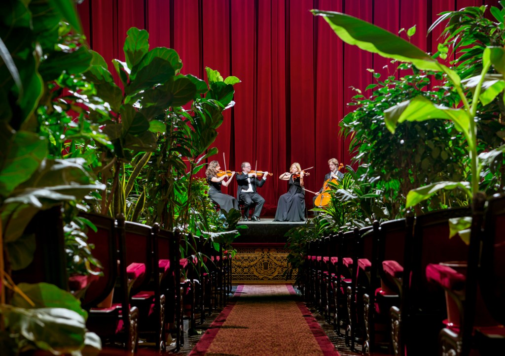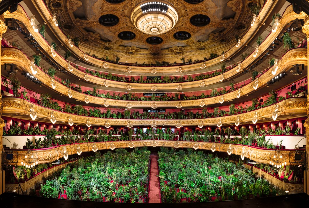 after the covid-19 lockdown was lifted in Spain, artist Eugenio Ampudia’s Concert For the Biocene was displayed in the Gran Teatro del Liceu. the exhibit occurred on June 22nd and, as can be seen through the provided images and video above, consisted of a beautiful string quartet performance to an audience made entirely up of different plant life.